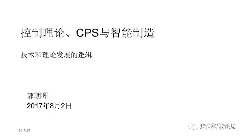 在“走向智能论坛”微信公众号回复“20170803”,可免费下载“郭朝晖:控制理论、CPS与智能制造“讲座完整PDF