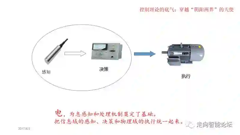 但是,到了维纳的时代,电的使用已经相当广泛了。我们知道,很多信息可以用传感器转化成电信号;电信号可以直接用于运算,比机械容易多了。而且,处理结束后又可以进行放大,变成强电,来驱动机械动作。这样,“电”就可以自由地从信息领域跑到物理实体,就像孙悟空穿越阴阳两界一样方便。于是,感知、决策和执行就可以借助“电”这个奇妙的东西,自动地统一起来了。依靠这个机制,多种控制问题都可以实现。在我看来,这是控制论产生的一个重要背景。在《控制论》这本书中,维纳把弱电的产生作为新时代产生的标志,大概就是这个道理。