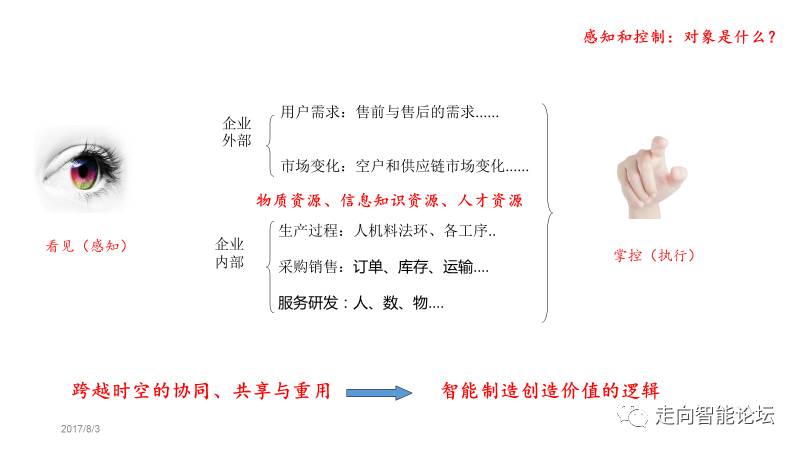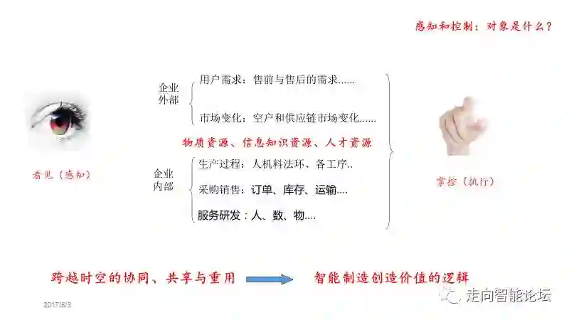 我把感知、控制的东西可以归结为“资源”。包括物质资源、信息知识资源、人力资源等等。这些资源可以是企业内部的,可以是企业外部的。企业外部的可以包括下游用户,也可以包括上游供应商、以及合作伙伴;企业内部可以包含生产制造、销售采购、研发服务等各个业务板块。