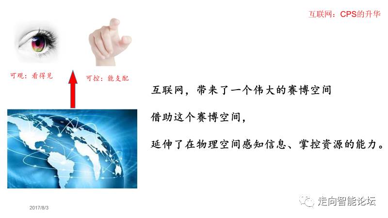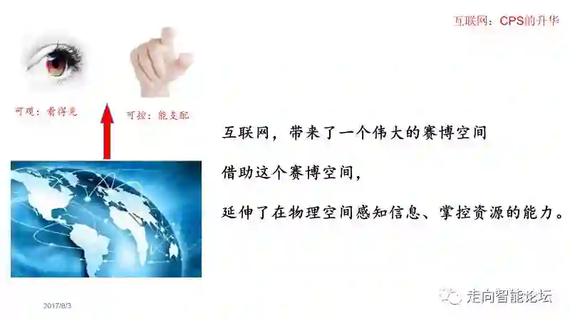 现在回到刚才的话题:互联网的本质作用是什么呢?在我看来,就是提升了人们感知世界、控制资源的能力。有了互联网,我们可以感知到全世界的各种资源和变化,可以使用全世界的资源;我们也可以为全世界提供服务。互联网这张网,形成了一个伟大的Cyber空间。人们可以通过这个Cyber空间,“可观”、“可控”的能力跨越了时空。这样一来,基于网络,就形成了一个CPS的体系、CPS的群体;这种体系不断扩张、不断攻城略地、成燎原之势。正是这种变化,为人类带来的巨大的变化。越来越多的事情可以通过网络来做了。