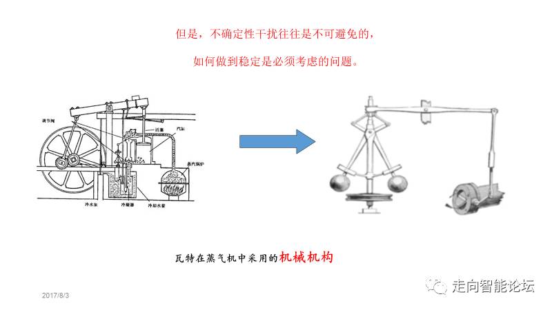 如果获得确定性的?最好的办法是“御敌于国门之外”。把各种干扰挡住,不让它影响系统的稳定运行。比如,机器的外壳要有一定的强度,其实就是保护设备本身、阻止外部干扰啊。但是我们也知道:现实中总有这样或那样的干扰,导致设备和生产不稳定、而且是没办法挡在系统外面的。比方说蒸汽机。燃烧的时候,火苗总会时大时小、产生的蒸汽时多时少,这是不可避免的。这种现象会导致机器运转不稳定,是人们所不希望的。当年,瓦特就想了一个办法来解决这个问题。这个办法很奇妙:转速快的时候能把速度降下来,转速慢的时候又能把速度提上去,让干扰尽量少地影响转速。这个办法很妙,可惜的是缺乏通用性、只能解决具体问题,很难被其他机器借鉴。
