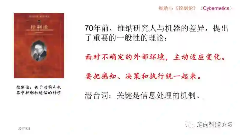在我看来,这个理论有个潜台词:要想让机器像人或动物一样聪明,关键是要有信息感知、传送和处理的机制。有了这个机制,就可以把“信息域”的感知、决策与“物理域”的执行自动地结合在一起,也就是可以做到自动化了。按照《三体智能革命》的观点,把感知、决策和执行自动地结合在一起,具备了已经智能的最基本的特征。事实上,控制论很早之前就被列入人工智能的三大学派之一。