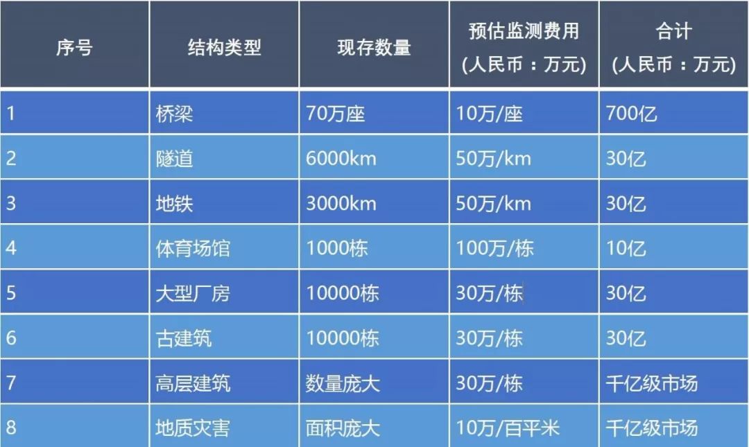 据统计,截止2015年,国内现有大小桥梁70多万座,隧道8000多座(总长度4000多公里),地铁总长度超过3000公里,大型体育场馆上千座,老旧建筑,高层建筑数量庞大,未来都有实时在线监测预警的需求。同时日益增多的地质灾害也是一个庞大的监测市场。