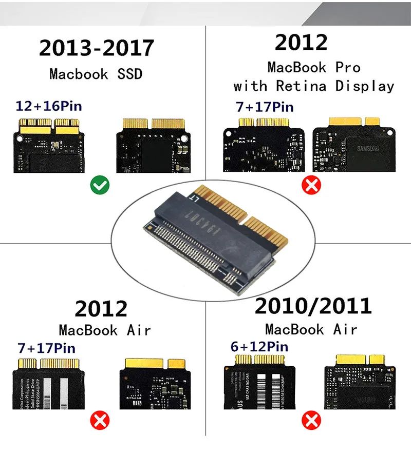 早先的 MacBook 是支持更换 SSD 的,只不过嘛,你要么花大价钱找苹果官方更换,要么选购苹果指定的兼容 SSD——但也便宜不了多少。好在,聪明的配件厂商做出了 MacBook 专用的固态硬盘转接卡,国内最便宜的 20 来块钱就能买到,从此摆脱苹果束缚,用上第三方的 M.2 硬盘。