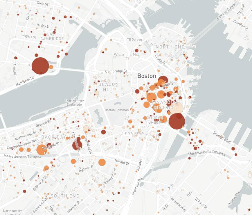 这一工具用来描述十分密集的数据点。可以通过图中数据点的密度直观的获取对应数据的地理分布和强度。例如交通、互联网流量、社交媒体的点击量等,都可以用这种方式呈现出来。