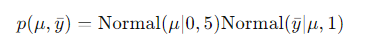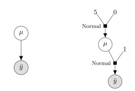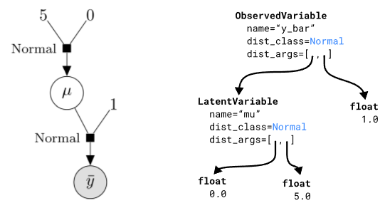 mu =LatentVariable("mu",Normal, [0.0, 5.0])y_bar =ObservedVariable("y_bar", Normal, [mu, 1.0],observed=5.0)print(mu)#=> <__main__.LatentVariable object at 0x7f14f96719a0>print(mu.dist_args)#=> [0.0, 5.0]print(y_bar)#=> <__main__.ObservedVariable object at 0x7f14f9671940>print(y_bar.dist_args)# => [<__main__.LatentVariable object at 0x7f14f96719a0>,1.0]