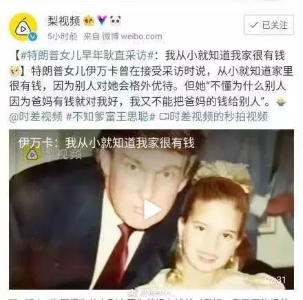 比如,特朗普的大女儿伊万卡(Ivanka Trump),刚刚就紧随王校长的步伐,爆出自己“小时候就知道家里很有钱。”