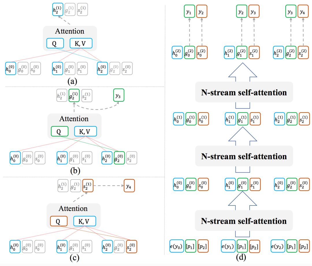 图2:(a) 为main stream self-attention;(b) 为1-st predicting stream self-attention;(c) 为2-nd predicting stream self-attention;(d) 展示了n-stream self-attention的输入输出及流程。