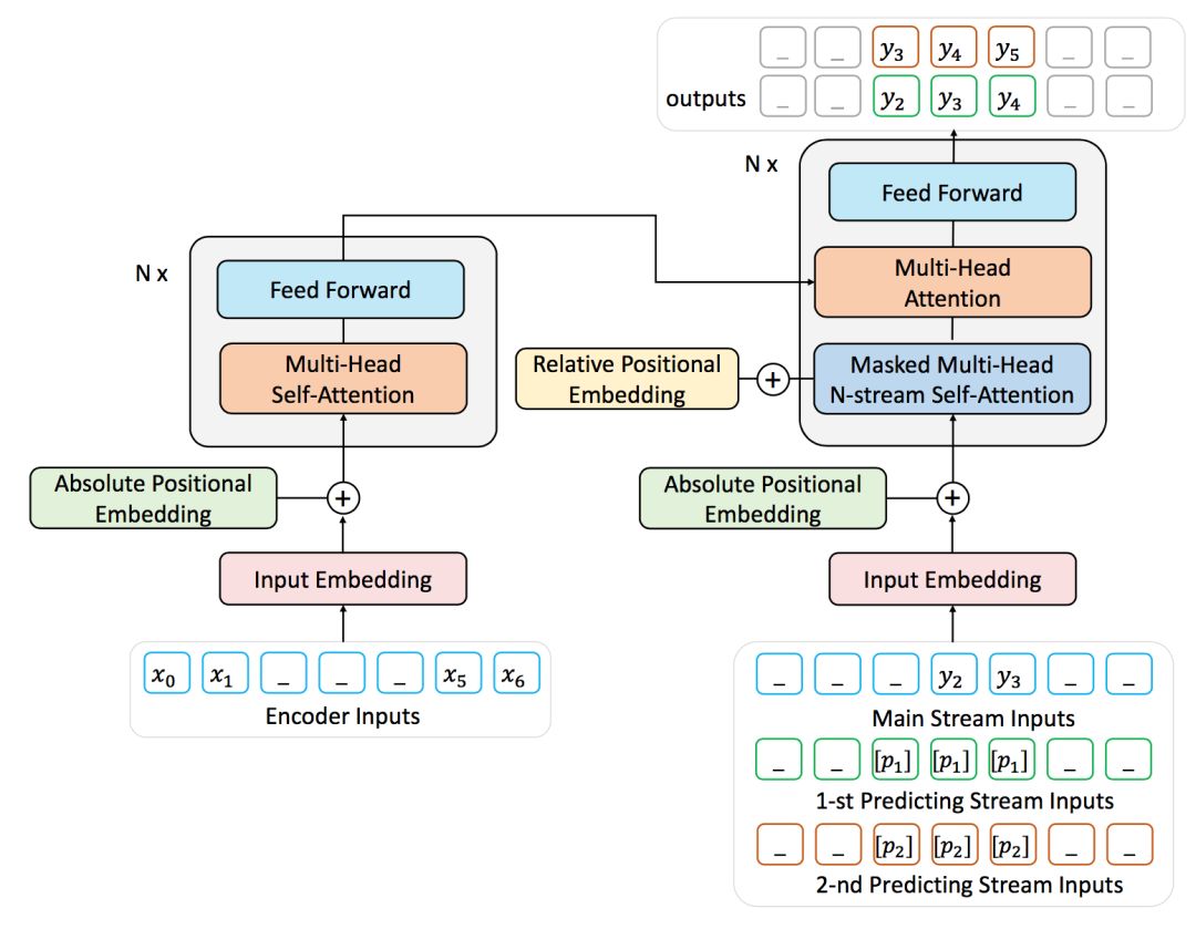 由于难以获取到大量带标记的序列对数据,我们用去噪的自编码任务通过大量无标记文本预训练 ProphetNet。去噪的自编码任务旨在输入被噪音函数破坏后的序列,让模型学习去复原原始序列。该任务被广泛应于 seq2seq 模型的预训练中,如 MASS、BART、T5 等。本文中使用 MASS 的预训练方式,通过引入提出的 predicting n-stream 自监督学习目标函数预训练 ProphetNet。我们以 bigram 形式的 ProphetNet 为例,整个流程如图3所示: