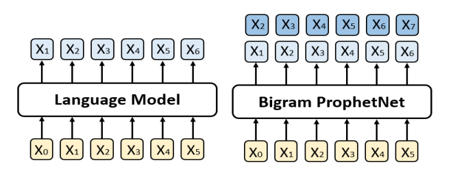 图1:左边是传统的语言模型,每一时刻预测下一时刻的字符。右边是 Bigram 形式下的 ProphetNet,每一时刻同时预测未来的两个字符。