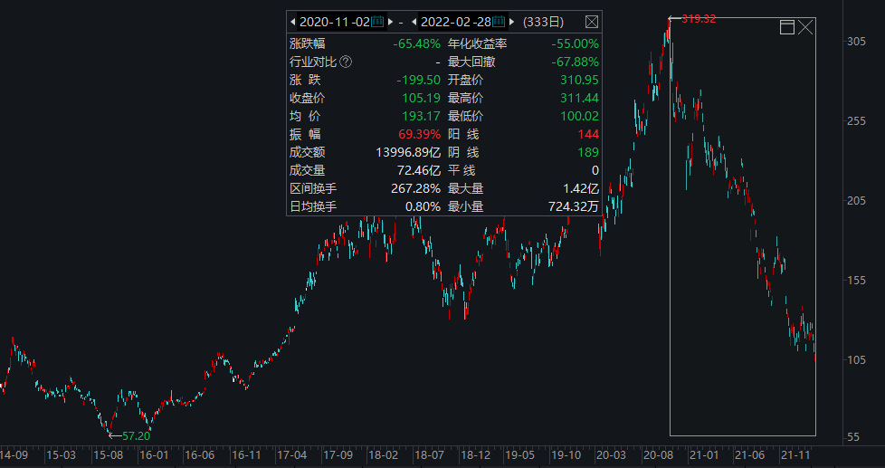 从估值的角度来看 ,2020年11月至今(2022年2月28日),阿里的股价已经从300多美元一路调整至100美元附近,整体跌幅接近70%,期间阿里的PE估值也从40倍左右降至15倍左右,基本达到了上市以来的较低水平。与此同时,如果以目前的市值简单估值,核心业务中国商业部分的PE估值也只有10倍左右,可以说无论是从横向还是纵向对比,阿里目前的估值均处在一个较为便宜的水平。