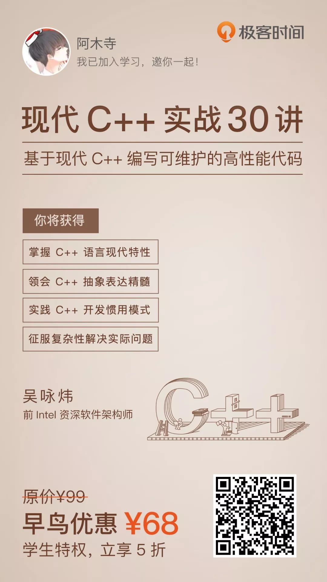 1、早鸟价 ¥68,原价 ¥99。结算时,输入优惠口令「CPLUSPLUS」再减 5 元,到手价 ¥63,口令仅限「前 200 人」有效。