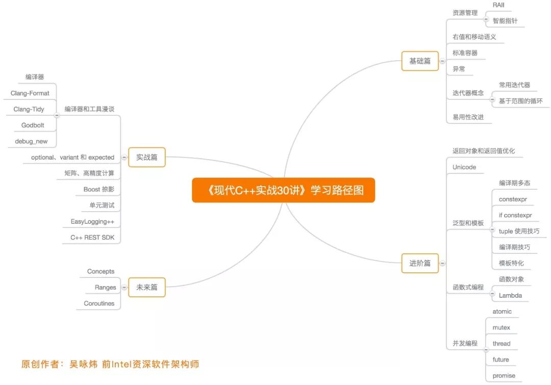 这些新功能是什么?为什么让C++变得更容易了?我想你可以在专栏《现代C++实战30讲》中找到答案。想高效学习 C++?我特别认同专栏作者前 Intel 资深软件架构师吴咏炜列出的这份学习路径,作者深耕 C++ 语言 30 年,相信肯定对你有帮助: