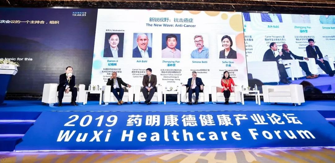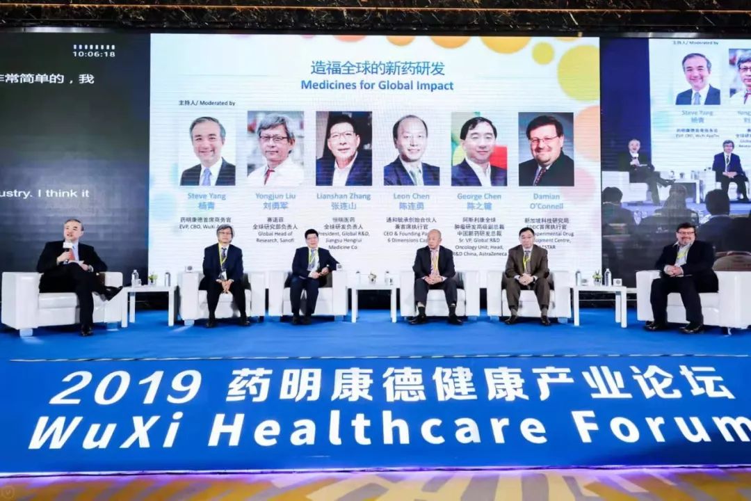 专题讨论嘉宾(从左到右):药明康德执行副总裁兼首席商务官杨青博士,赛诺菲全球研究部负责人刘勇军博士、恒瑞医药全球研发负责人张连山博士、通和毓承创始合伙人兼首席执行官陈连勇博士、阿斯利康全球肿瘤研发高级副总裁,中国新药研发总裁陈之键博士,以及新加坡科技研究局首席执行官Damian O’Connell博士
