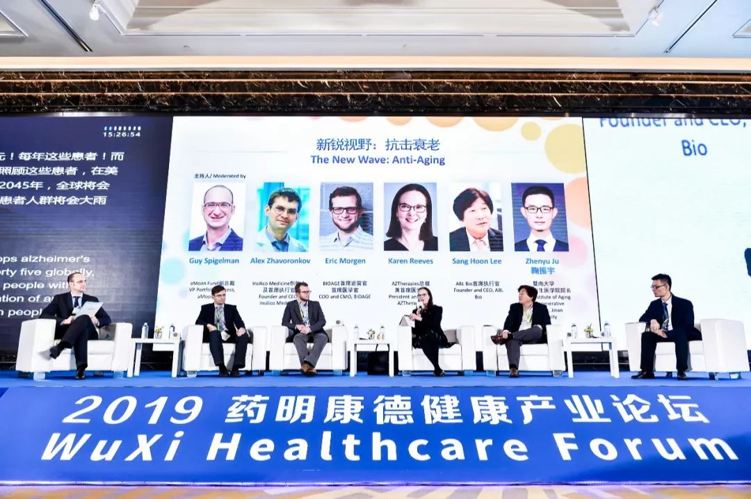 专题讨论嘉宾(从左到右):aMoon Fund副总裁Guy Spigelman先生、Insilico Medicine创始人及首席执行官Alex Zhavoronkov博士、BIOAGE首席运营官、首席医学官Eric Morgen博士、AZTherapies总裁兼首席医学官Karen Reeves博士、ABL Bio首席执行官Sang Hoon Lee博士、以及暨南大学衰老与再生医学院院长鞠振宇教授