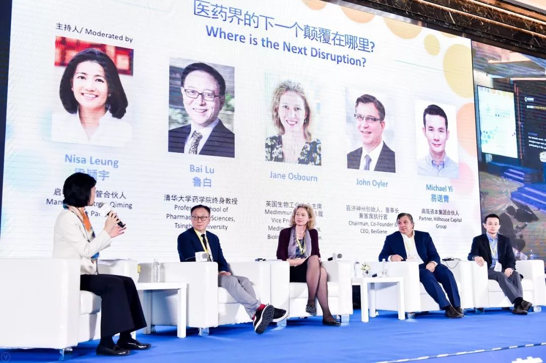 专题讨论嘉宾(从左到右):启明创投主管合伙人梁颕宇女士、清华大学药学院鲁白教授、英国生物工业协会主席,MedImmune研发副总裁Jane Osbourn博士、百济神州创始人、董事长兼首席执行官John Oyler先生、以及高瓴资本合伙人易诺青先生