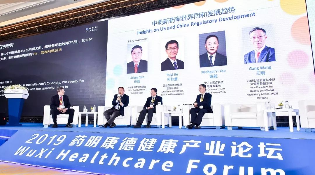 专题讨论嘉宾(从左到右):药明生物首席质量官辛强博士、宝石花医疗科技联席董事长姚毅博士、国投创新医疗健康首席科学家何如意博士、以及药明生物质量与全球监管事务副总裁王刚博士