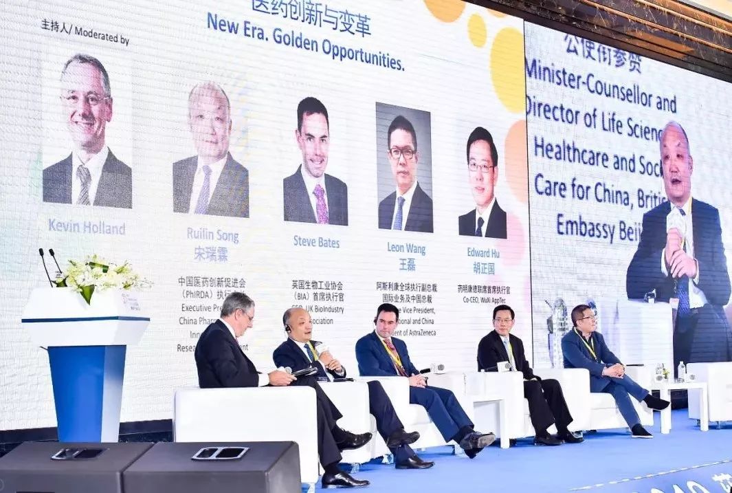 专题讨论嘉宾(从左到右):英国驻华大使馆公使衔参赞Kevin Holland先生,中国医药创新促进会(PhIRDA)执行会长宋瑞霖先生、英国生物工业协会(BIA)首席执行官Steve Bates先生、药明康德联席首席执行官胡正国先生、以及阿斯利康全球执行副总裁,国际业务及中国总裁王磊先生