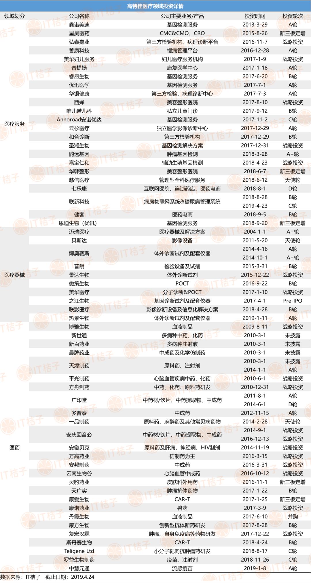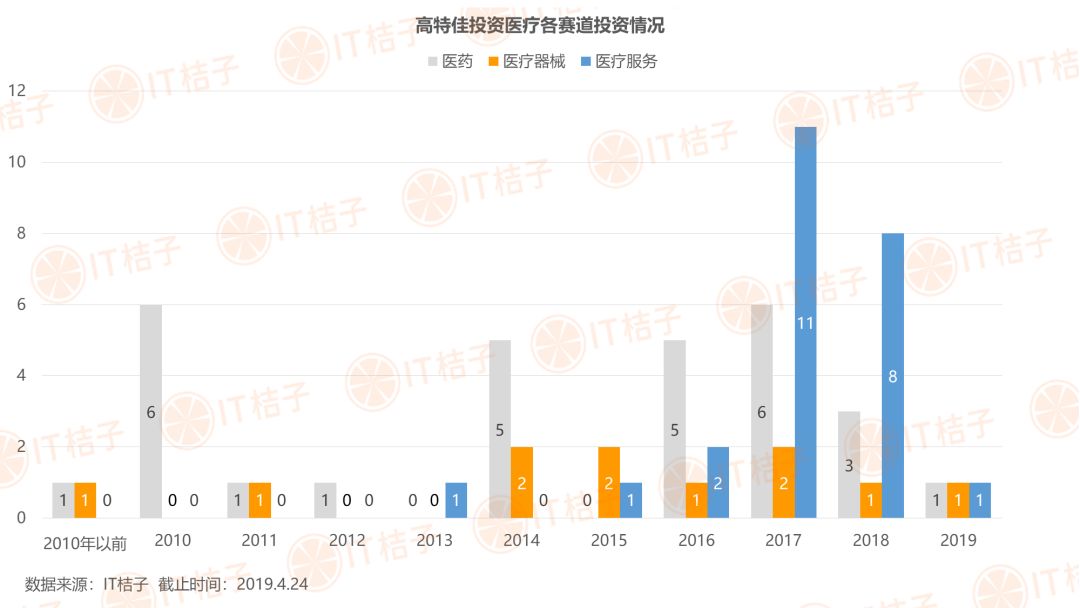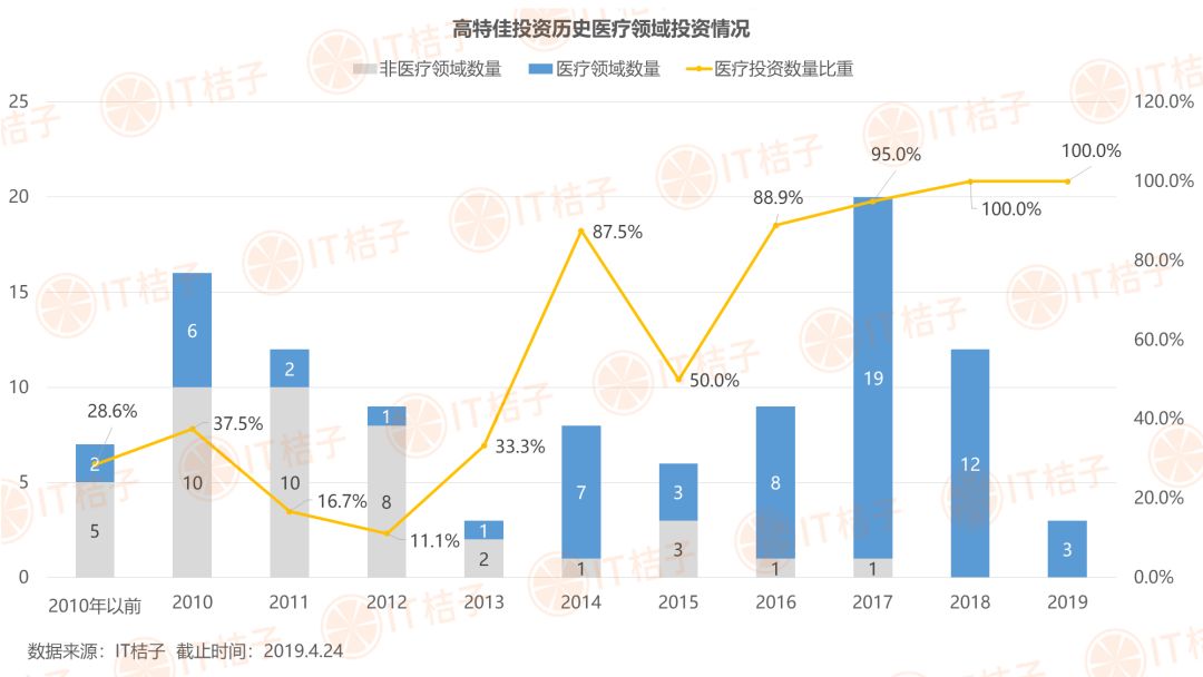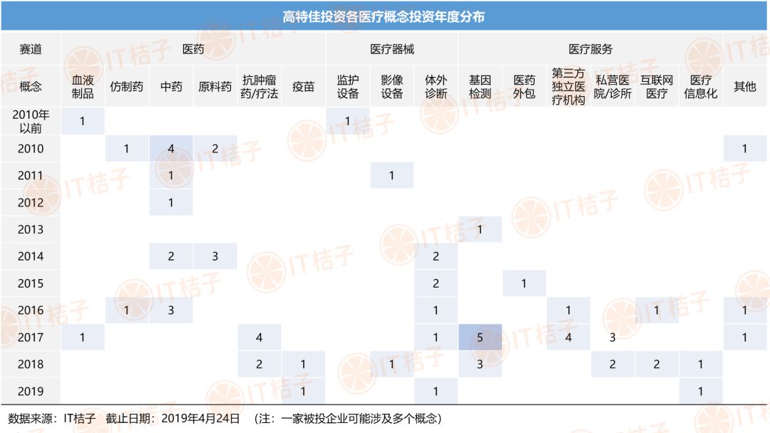 而从 2017 年开始,可以很清楚的看到医疗服务已经成为了高特佳投资的第一大方向。