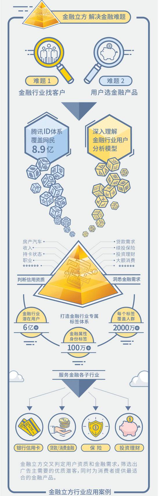 为解决金融行业面临的营销痛点,腾讯社交广告推出了“金融立方”整体解决方案,通过海量用户数据精准了解用户需求,预判用户行为,从社交数据中提炼出用户的信用资质与金融需求,帮助金融各子行业精准发掘最有需求的用户,挖掘数据的最大价值。