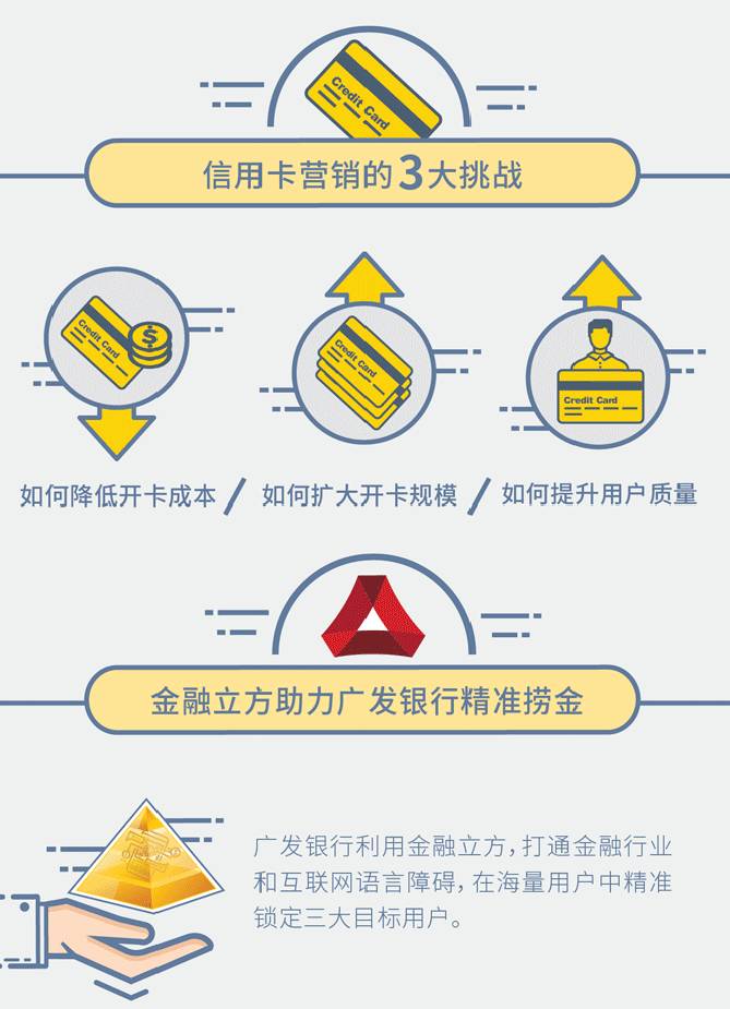 金融立方洞察持卡金融用户的状态,帮助广发信用卡投其所好,为不同需求匹配不同的卡种,在助力广发银行超额完成发卡任务的同时,显著降低获客成本。