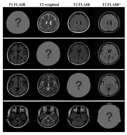 在数据集中有四种类型的 MR 对比图像:T1-FLAIR (T1F),T2-weighted(T2w),T2-FLAIR (T2F) 和 T2-FLAIR (T2F)。前三个对比度是从磁共振图像编译(MAGiC,GE Healthcare)获得的,T2-FLAIR * 是通过第三对比度(T2F)的不同MR扫描参数的附加扫描获得的。MR contrast synthesis 数据集也是作者进行本次研究的目的性数据集。