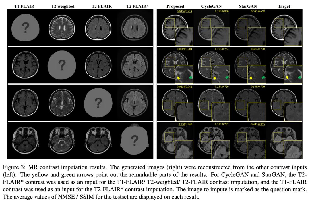 在 MR 的数据集上,实验对比了 CycleGAN、StarGAN 和 CollaGAN: