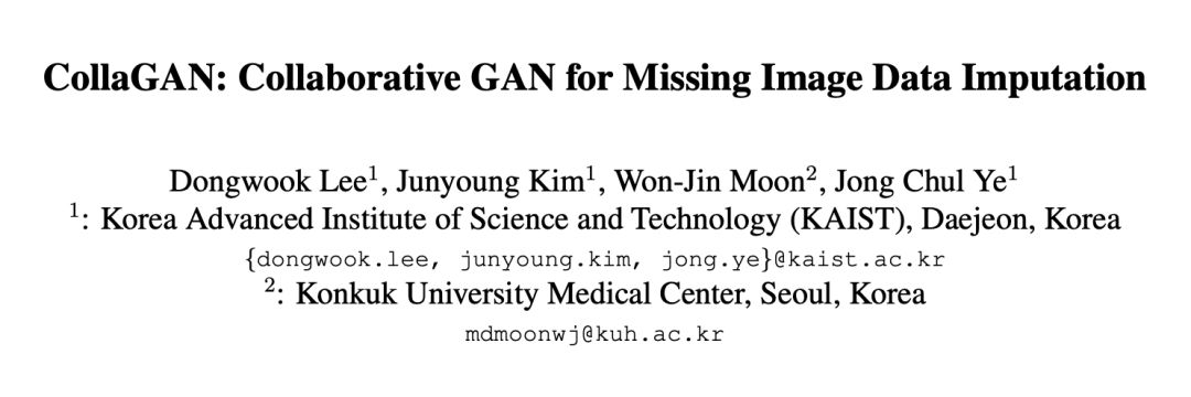 CollaGAN 通过在单个发生器和判别器的帮助下协同组合来自可用数据的信息,提出了一种新颖的 CollaGAN 架构,用于丢失图像数据插补。与现有方法相比,所提出的方法产生了更高视觉质量的图像。