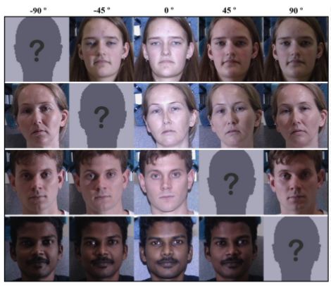 CMU Multi-PIE 数据集使用了 Carnegie Mellon Univesity 多姿态照明和表情面部数据库的子集,250 名参与者,并且在以下五种照明条件下选择中性表情的正面:-90°(右), - 45°,0°(前),45° 和 90°(左),并将图像裁剪为 240×240,其中面部居中。