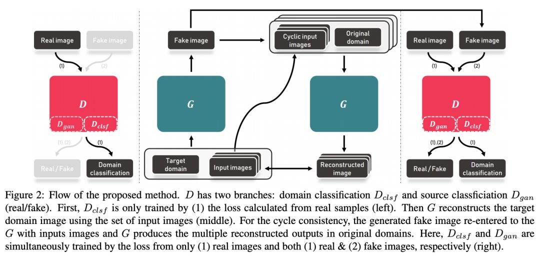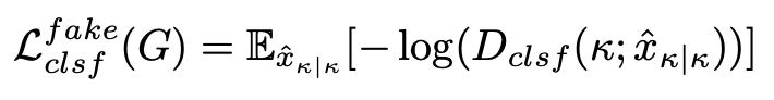 模型框图的最右侧就是训练中判别器的,判别器在训练阶段除了分清图片的真假还有就是通过分类器去优化生成器网络。我们解释下怎么通过分类去优化生成器,通过训练发生器 G 以产生由 Dclsf 正确分类的假样本。因此,对于 G,在优化生成域分类当最小化损失: