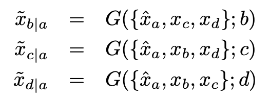 这个图咋一看有些抽象,我们待会再详细分析,先把涉及到的参量做个定义。原文为了便于解释,假设域中含有 4 类样本:a、b、c、d。比如,生成器为了生成域a的样本,则生成器则会参考图像域 b、c、d,将 b、c、d 协同送入生成器获得图像集。其中上标 C 表示补充集,完整表示为: