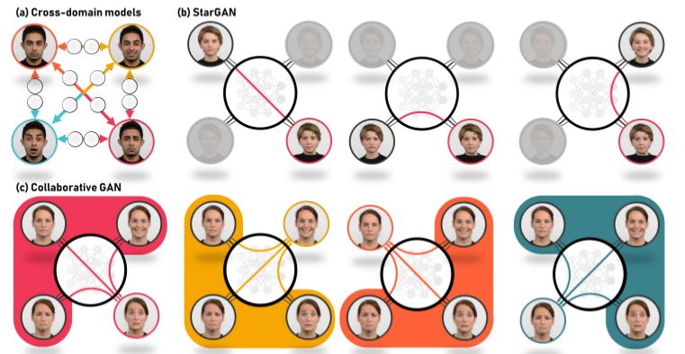 上图 (a) 可以表示单图到单图的模型,代表由 CycleGAN;(b) 图为 StarGAN 转换图示,它是由原输入去转换成对应标签的图像;(c) 则是利用除目标域图像外的其余图像一起作用生成目标标签图像。总结一下协同生成对抗网络(CollaGAN)的优点: