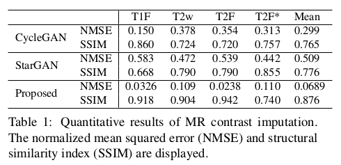 在定量分析上,作者采用重建和目标之间计算归一化均方误差(NMSE)和结构相似性指数(SSIM)来衡量,文章还花了一定篇幅介绍了 SSIM 的度量计算公式(感兴趣的可以自行阅读原文)。在定量上对比 CycleGAN 和 StarGAN 得到了优异的效果。