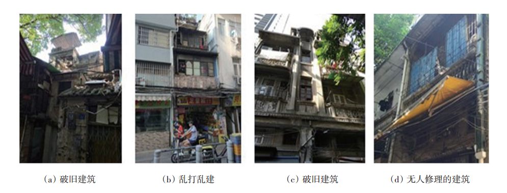 ▲ 违建现象明显。在一德路历史街区的住区调研范围内的建筑产权以单位公房、街道公房和私人房产 3种类型为主。一德路居住区内的建筑以砖木结构为主,由于砖木结构建筑的使用时间有限,建筑损耗程度已经很高,许多老旧建筑需要进行整治更新(图 10)。由于住区内的公房由多户居民共同居住而不利于维修整饬,导致住房年久失修看起来十分破败;部分居民不顾住房建筑的整体风貌随意改修,对原有建筑造成了无法弥补的破坏;部分居民推倒原有建筑,新建不同风格的住宅建筑,使其与原有建筑风貌格格不入。