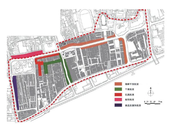 ▲ 一德路商业业态演变脉络。一德路街区的历史可以追溯到明清时代,最初被称为“三栏”,也就是蔬菜、鱼类、干果等贸易的交易市场。在民国时期的城市建设中拆掉了古城墙改建道路,越来越多的骑楼在道路两旁建立起来,形成了独具广州特色的骑楼商业街。1940年后,一德路商业街的海味和干果贸易发展良好,逐渐形成了海味干果特色街。1990年后,一德路商业街入驻了许多文具品牌,文具贸易发达。近年来,一德路更是渐渐发展起了服饰贸易。因此,目前一德路的商业业态基本可以分为 4大类:文具、海鲜干货、干果与服装批发(图5)。