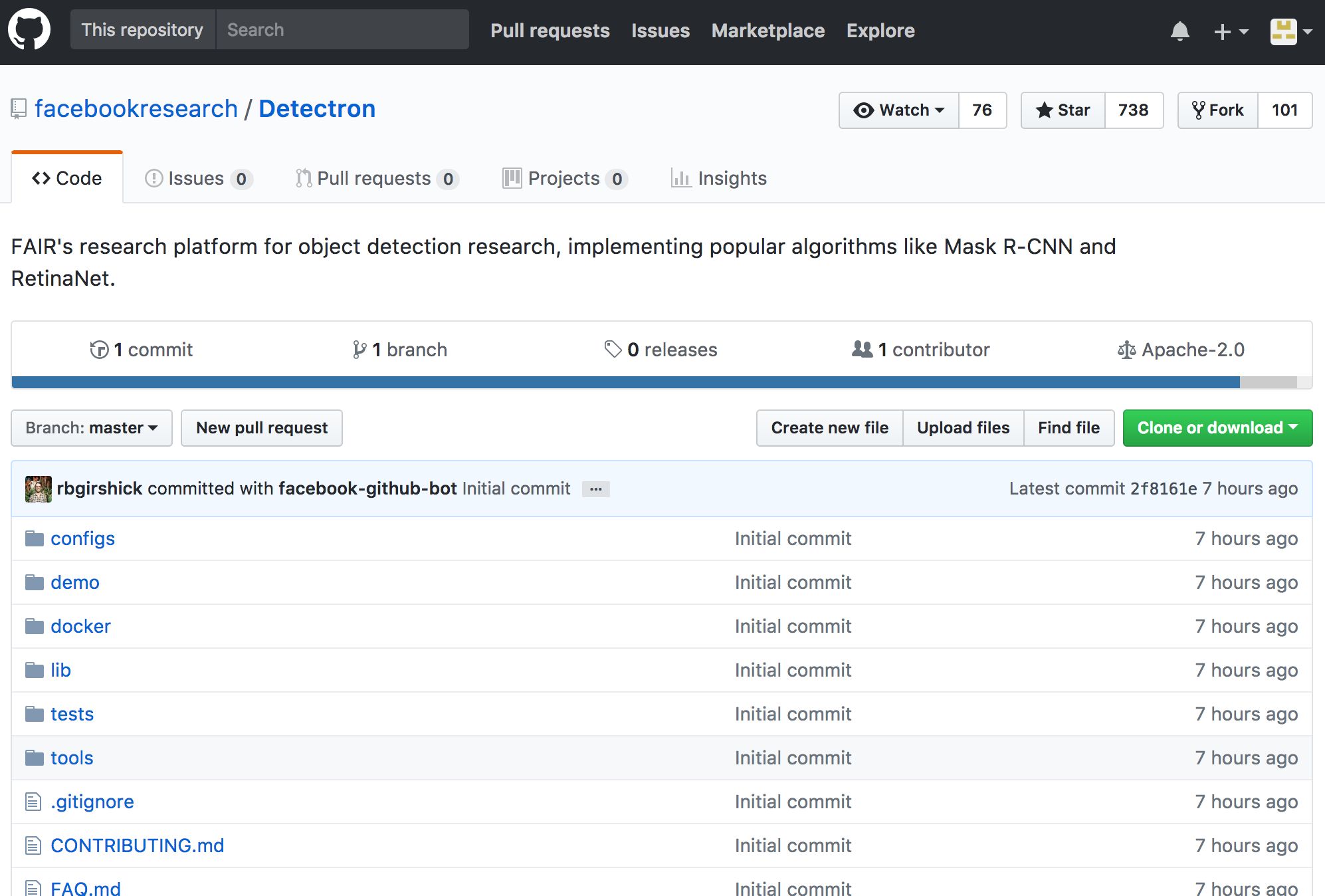 截至量子位发稿,Detectron在GitHub上放出7小时,已经收获738颗星标、101次Fork。