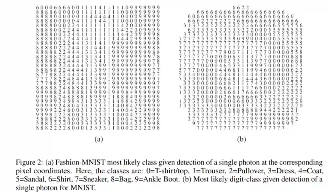 具体来说,研究者想要探究的是:在一个普通的图像分类问题中,如果你必须在通过一个 filter(可以显示来自测试集的示例图像)的第一个光量子(光子)之后做出决定,最高准确率能达到多少?在 MNIST 手写数字数据集上(28×28 像素),最佳经典方法是检测落在其中某个像素上的光子,然后使用在训练集上观察到的 per-pixel 概率(即光强度)分布来选择最有可能的数字类别。这需要将每个示例图像的亮度缩放到一个单位和(unit sum),以获得一个概率分布。在 MNIST 数据集上,上述经典方法可以实现 21.27% 的分类准确率,大大高于随机结果(10%)。每个像素最有可能的数字类别如下图 2(b)所示。