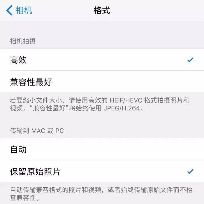 你可以通过设置 -> 相机 -> 格式看到这个选项。值得注意的是,新的压缩格式仅支持配备 A10 芯片以上的设备,即 iPhone 7 及之后的系列。不过,采用 A9 芯片的设备可以对新格式进行解码和播放。如果你的设备容量足够,我其实不太建议打开此选项,因为你的照片在其他设备上可能会出现兼容性问题。