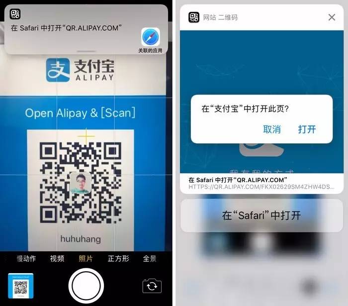 大多数应用扫描二维码时,都需要将二维码置于扫描器样式的小方框中。而在使用原生相机扫描时,从任意角度对准二维码都可以很好地识别。当相机识别出二维码时,会从顶部弹出横幅并显示与之关联的应用。你可以通过点击,跳转到相应应用完成后续操作。
