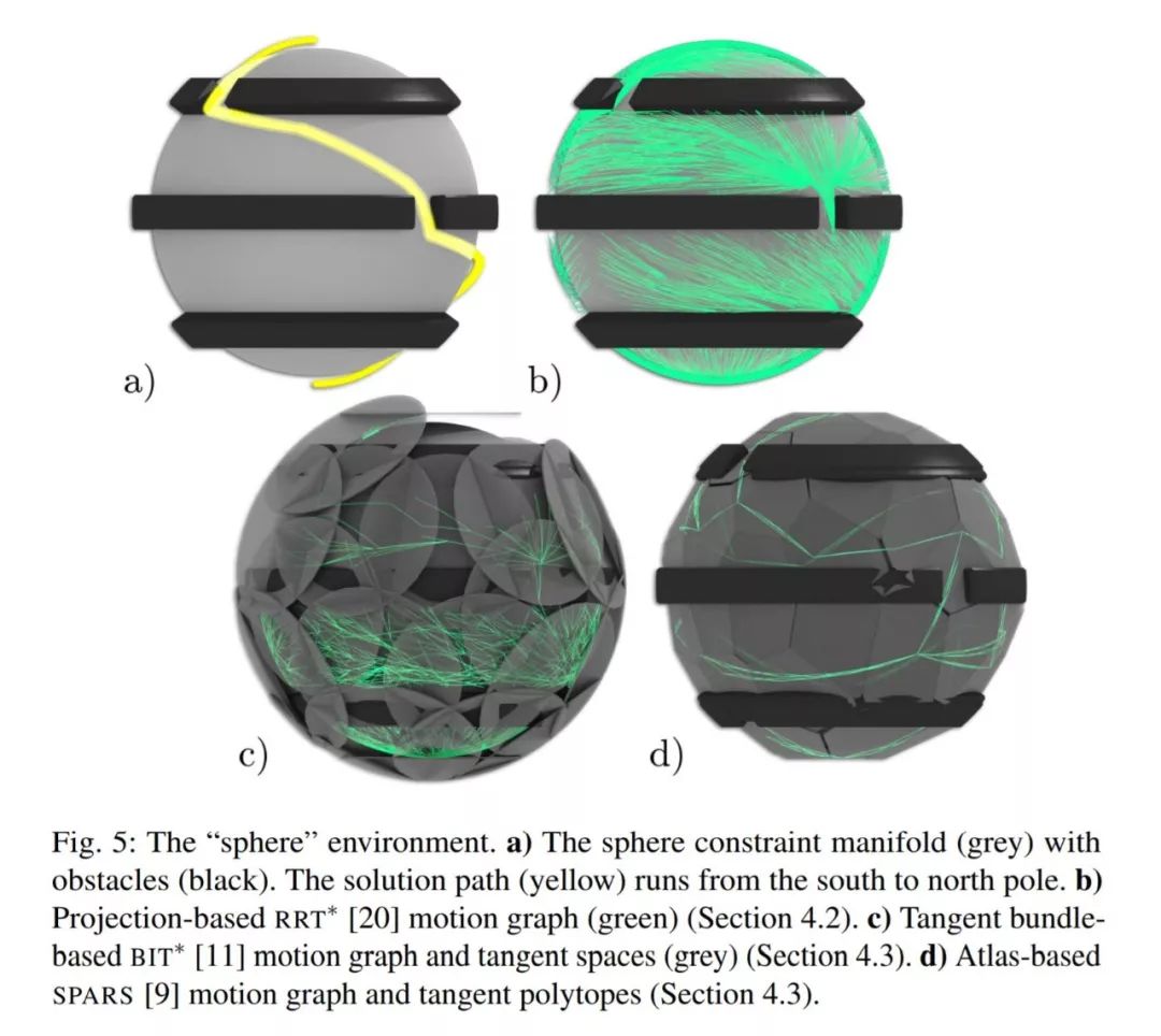 但是,我们可以从另一个角度看问题。机器人的末端姿态就是一个 SE(3) 李群。保持末端水平,可以认为是一个 R3 空间与 SO(2) 空间的半直积,这也是一个李群。于是,我们可以直接在李群内或者 Tangent Space 上跑一个 RRT,例如 Tangent Bundle RRT[6]与 AtlasRRT[7]