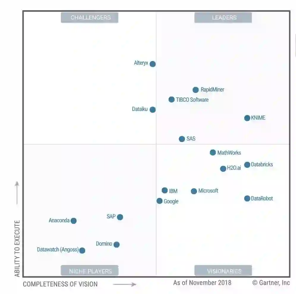 在领导者象限中,Gartner 列入了四家供应商,包括:KNIME、RapidMiner、TIBCO Software、SAS。