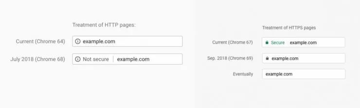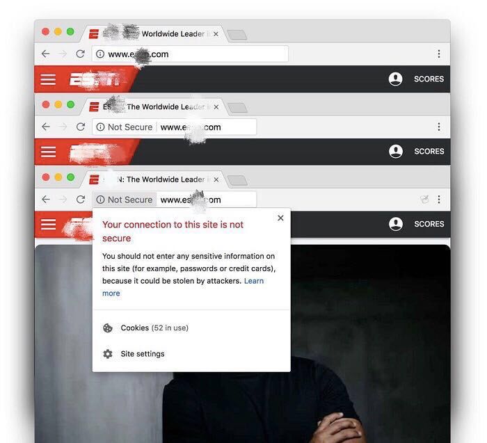 当然,这是今年 5 月谷歌早就透露的新版 Chrome 的重要功能。当时,它还宣布,从 Chrome 69 开始(今年 9 月发布),如果网页缺乏安全防护,HTTP/HTTPS 页面上就只会显示“不安全”的标记了,而 HTTPS 网页上的“安全”标记则会被移除。