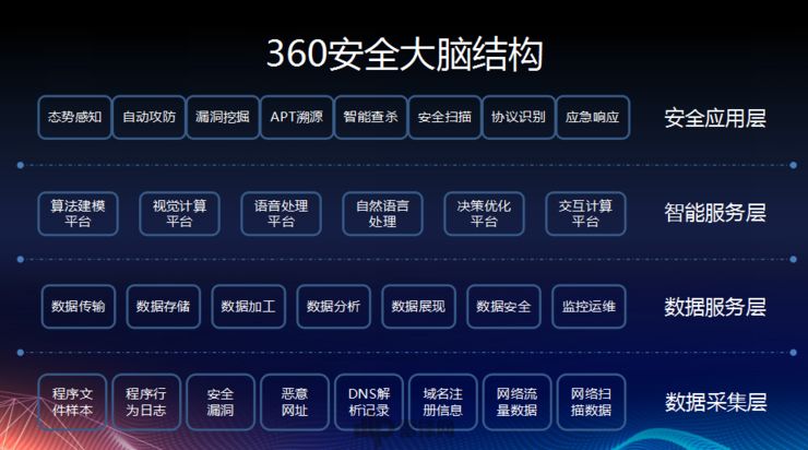 为了实现这些能力,安全大脑由数据采集层、数据服务层、智能服务层、安全应用层的一些技术支撑。