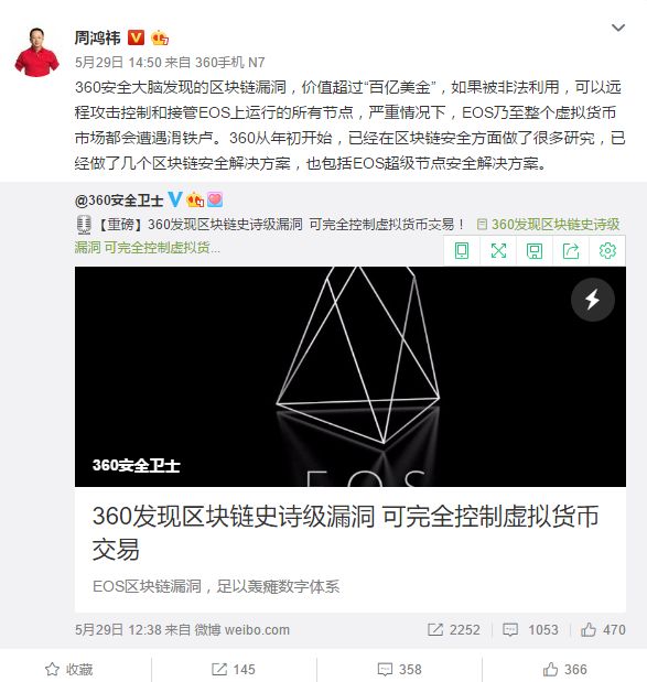 5 月 29 日,360 技术团队曝光 EOS 的巨大安全漏洞,老周在微博上安利了一把其区块链安全解决方案和安全大脑。一天之内,我们又发现了币安、欧链、EOS LaoMao、Dbank等与 360 达成了项目合作。