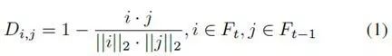 使用Faster R-CNN([3])检测获取图像中的对象,其中300个区域提议和锚步长为8个像素,骨干卷积网络是在ImageNet上预训练的预训练的Inception-Resnet-V2模型[24] 使用KITTI 2D物体检测数据集[4],[5]对数据集进行微调。对于每个检测到的对象,由Fi表示的亲和度特征被提取,并且对于帧 t> 1,成对的特征余弦距离矩阵Di*j被导出如下: