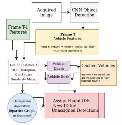 图1 :跟踪器模型的流程图。CNN处理获取的图像以进行对象检测。对于每个检测特征向量和RGB颜色直方图与前一帧进行比较。根据其亲和度测量来分配对象IDS。