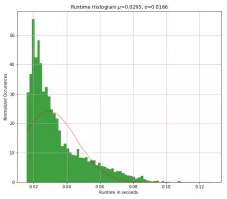 具有亲和力成本矩阵的跟踪分配的计算复杂性取决于当前和先前检测的最小数量,详细分析在[25],[28]中给出。鉴于在英特尔i7 - 6820HK上以2.70 GHz CPU测试包含检测对象的帧时的运行时性能,我们的跟踪器模型的平均运行时间为0.0295秒或34 fps,标准偏差为0.01228秒。运行时直方图和概率分布如图7所示。