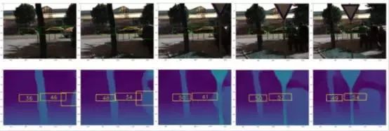 图2:顶行示出了用于KITTI对象跟踪训练序列0001,帧160到164的检测到的车辆和底行立体视差图。由边界框标记的区域的平均差异值以黄色显示。即使低的遮挡率也会导致检测到的对象的平均差异度量在序列中波动,并且不提供稳定的亲和力特征。