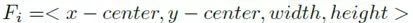 最后,如果使用一个物体与其他被检测物体的遮挡比率,当遮挡另一个物体的最近物体消失时,这两个物体之间会交换值。特征向量Fi由其边界框的特定值定义如下: