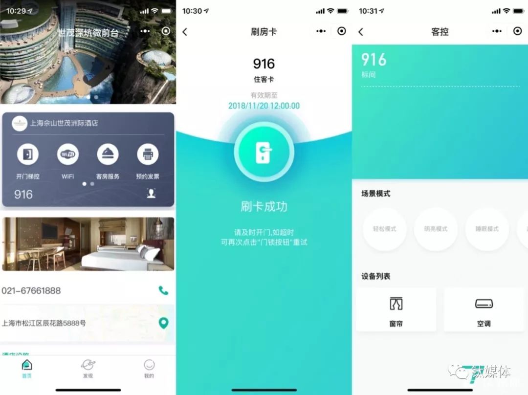 黑科技元素,是深坑酒店在特色景观之外的另一大卖点。刷脸就餐、小程序电子房卡、客房控制、客房管家在线服务,这一套由微信提供的智慧酒店解决方案,集成了微信支付、小程序、基于腾讯优图的人脸识别等功能,包括酒店预订、入住、离店等在内的诸多住店环节,都可以通过小程序进行操作。